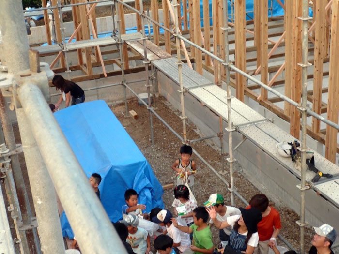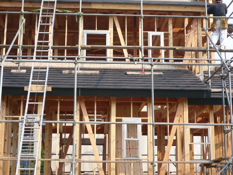 - 木造軸組工法の場合、基礎の上に柱やハリなどの構造材を組んでいく作業を建前(タテマエ)といい、